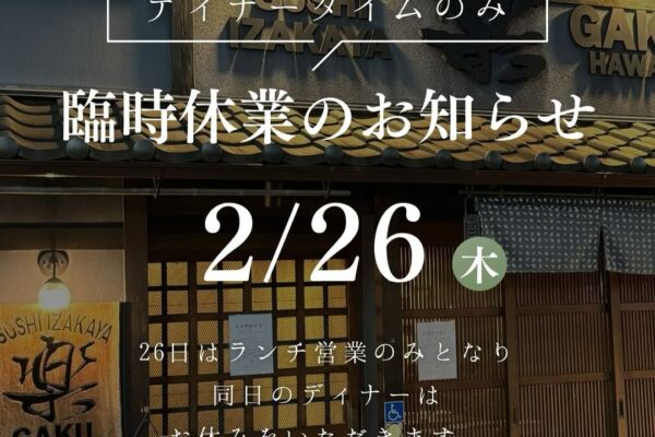 📢2/26 ディナー臨時休業のお知らせ いつも SUSHIIZAKAYA 楽 をご利用いただき、 誠にありがとうございます。 誠に勝手ながら、2月26日(木曜日)は店舗メンテナンスのため、ディナー営業…